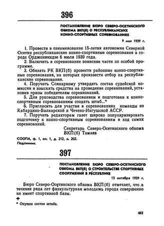 Постановление бюро Северо-Осетинского обкома ВКП(б) о строительстве спортивных сооружений в республике. 13 октября 1939 г. // СООПА, ф. 1, оп. 1, д. 216, лл. 185-186. Подлинник.