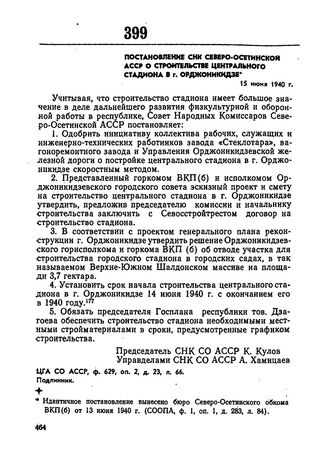 Постановление СНК Северо-Осетинской АССР о строительстве центрального стадиона в г. Орджоникидзе. 15 июня 1940 г.