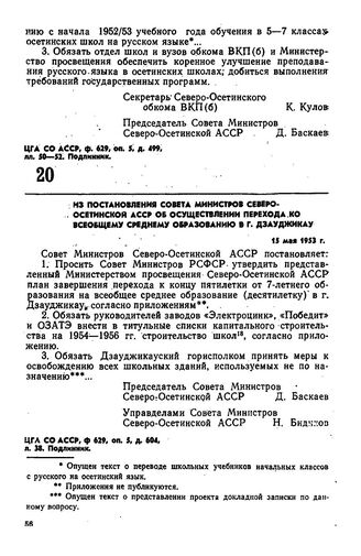 Из постановления Совета Министров Северо-Осетинской АССР об осуществлении перехода ко всеобщему среднему образованию в г. Дзауджикау. 15 мая 1953 г. // ЦГА СО АССР, ф. 629, оп. 5, д. 604, л. 38. Подлинник.
