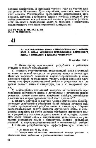 Из постановления бюро Северо-Осетинского обкома КПСС о мерах улучшения преподавания осетинского языка и литературы в школах республики. 31 октября 1969 г. // СООПА, ф. 1, оп. 63, д. 25, лл. 28-30. Подлинник.