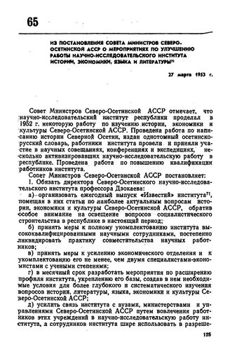 Из постановления Совета Министров Северо-Осетинской АССР о мероприятиях по улучшению работы научно-исследовательского института истории, экономики, языка и литературы. 27 марта 1953 г. // ЦГА СО АССР, ф. 126, оп. 3, д. 103, лл. 1-2. Подлинник.