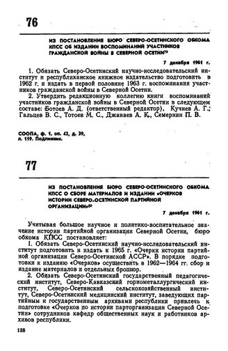 Из постановления бюро Северо-Осетинского обкома КПСС об издании воспоминаний участников гражданской войны в Северной Осетии. 7 декабря 1961 г.