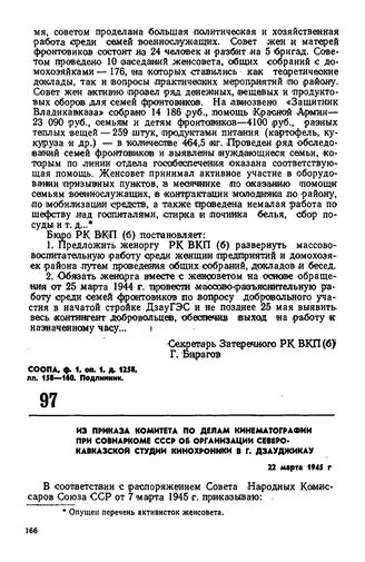 Из приказа Комитета по делам кинематографии при Совнаркоме СССР об организации Северо-Кавказской студии кинохроники в г. Дзауджикау. 22 марта 1945 г. // ЦГА СО АССР, ф. 794, оп. 1, д. 1-а, л. 1. Заверенная копия.