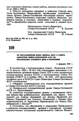Из постановления бюро обкома КПСС и Совета Министров Северо-Осетинской АССР об организации архивного дела в республике. 6 февраля 1959 г.