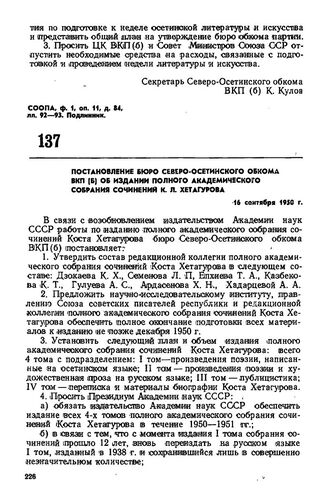 Постановление бюро Северо-Осетинского обкома ВКП(б) об издании полного академического собрания сочинений К.Л. Хетагурова. 16 сентября 1950 г.