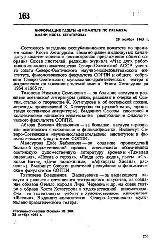 Информация газеты «В Комитете по премиям имени Коста Хетагурова». 28 ноября 1965 г. // «Социалистическая Осетия», № 280, 28 ноября 1965 г.