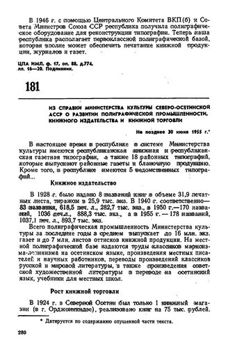 Из справки Министерства культуры Северо-Осетинской АССР о развитии полиграфической промышленности, книжного издательства и книжной торговли. Не позднее 30 июня 1955 г.