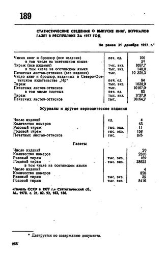 Статистические сведения о выпуске книг журналов газет в республике за 1977 год. Не ранее 31 декабря 1977 г. // «Печать СССР в 1977 г.» Статистический сб., М., 1978, с. 21, 82, 92, 163, 186.
