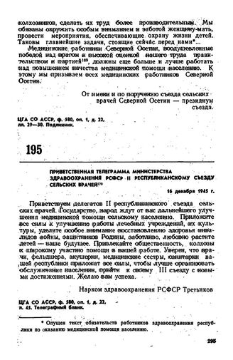Приветственная телеграмма Министерства здравоохранения РСФСР II республиканскому съезду сельских врачей. 16 декабря 1945 г.