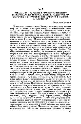 1774 г. июля 28. — Из реляции главнокомандующего Крымской армией генерал-аншефа В.М. Долгорукова Екатерине II о сражении под Алуштой и ранении М.И. Кутузова // «Чтения в императорском обществе истории и древностей российских при Московском университете». 1872 г., кн. 2. Материалы отечественные, стр. 21-26.