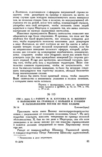 1789 г. марта 3. — Рапорт М.И. Кутузова И.И. Меллеру о положении на границах с Польшей и Турцией и расположении постов по реке Кодыме. Елизавет[град] // ЦГВИА, ф. 52, оп. 194, д. 532, л. 69 и об., подлинник.