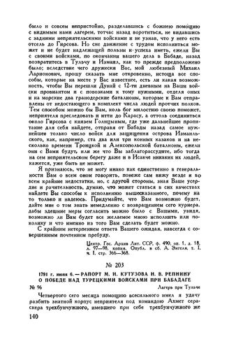 1791 г. июня 6. — Рапорт М.И. Кутузова Н.В. Репнину о победе над турецкими войсками при Бабадаге. Лагерь при Тульче // ЦГВИА, ф. 52, оп. 194, д. 594, л. 191 и об., подлинник. Опубл. в сб. «Фельдмаршал Кутузов» под ред. Н.М. Коробкова, стр. 66-67 с копии, хранящейся в ЦГВИА, ф. ВУА, д. 16531, л. 64.