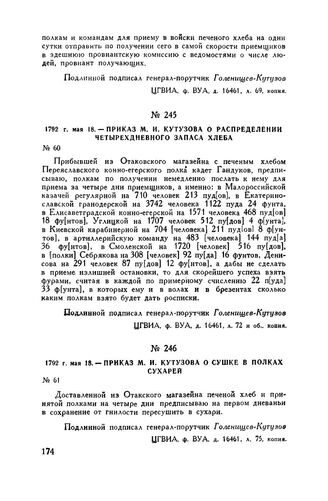 1792 г. мая 18. — Приказ М.И. Кутузова о сушке в полках сухарей // ЦГВИА, ф. ВУА. д. 16461, л. 75, копия.