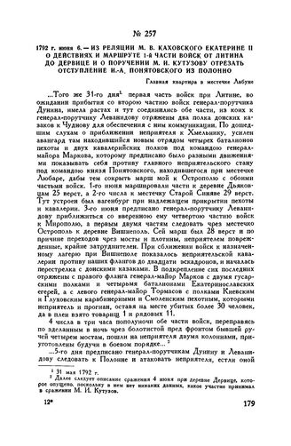 1792 г. июня 6. — Из реляции М.В. Каховского Екатерине II о действиях и маршруте 1-й части войск от Литина до Дервице и о поручении М.И. Кутузову отрезать отступление И.-А. Понятовского из Полонно. Главная квартира в местечке Лабуне // ЦГАДА, ф. 20, д. 328, лл. 143 об.-145 об., 149, подлинник.
