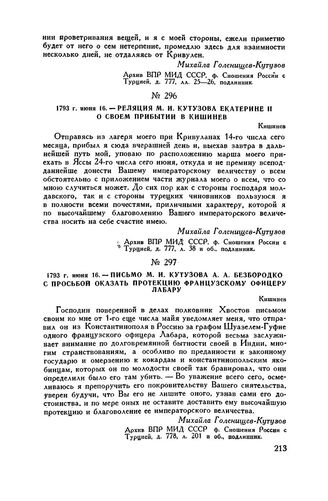 1793 г. июня 16. — Реляция М.И. Кутузова Екатерине II о своем прибытии в Кишинев. Кишинев // Архив ВПР МИД СССР, ф. Сношения России с Турцией, д. 777, л. 38 и об., подлинник.