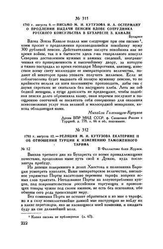 1793 г. августа 12. — Реляция М.И. Кутузова Екатерине II об отношении Турции к изменению таможенного тарифа. В Фалластоке близ Журжы // Архив ВПР МИД СССР, ф. Сношения России с Турцией, д. 777, лл. 55-56, подлинник.