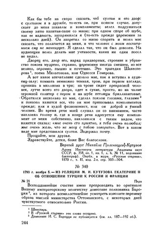 1793 г. ноября 5. — Из реляции М.И. Кутузова Екатерине II об отношении Турции к России и Франции. Пера // Архив ВПР МИД СССР, ф. Сношения России с Турцией, д. 777, лл. 183-186 об., 193-198 об,, подлинник.