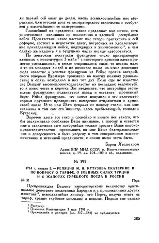 1794 г. января 5. — Реляция М.И. Кутузова Екатерине II по вопросу о тарифе, о военных силах Турции и о жалобах турецкого посла в России. Пера