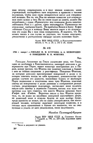 1794 г. января. — Письмо М.И. Кутузова А.А. Безбородко о поведении И.П. Фонтона. Пера // Архив ВПР МИД СССР, ф. Сношения России с Турцией, д. 778, лл. 227-228, подлинник (автограф).