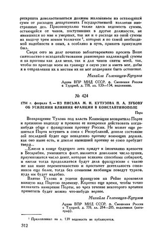1794 г. февраля 5. — Из письма М.И. Кутузова П.А. Зубову об усилении влияния Франции в Константинополе. Пера // Архив ВПР МИД СССР, ф. Сношения России с Турцией, д. 778, лл. 284-283, подлинник (автограф).