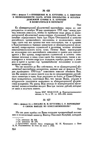 1794 г. февраля 14. — Письмо М.И. Кутузова С.Р. Воронцову о своем выезде из Константинополя. Пера // Архив ВПР МИД СССР, ф. Константинопольская миссия, к. 16, д. 23, л. 271, копия.
