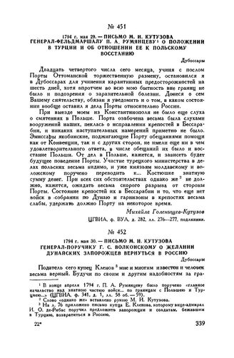1794 г. мая 30. — Письмо М.И. Кутузова генерал-поручику Г.С. Волконскому о желании дунайских запорожцев вернуться в Россию. Дубоссары // ЦГВИА, ф. 43, д. 82, л. 73 и об., подлинник (автограф).