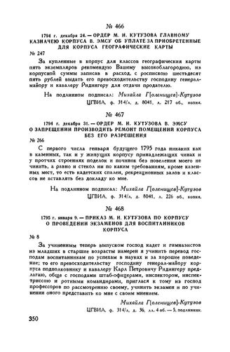 1794 г. декабря 31. — Ордер М.И. Кутузова В. Эмсу о запрещении производить ремонт помещений корпуса без его разрешения // ЦГВИА, ф. 314/л, д. 8041, л. 226 об., копия.