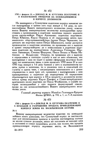 1795 г. февраля 13. — Доклад М.И. Кутузова Екатерине II с просьбой о разрешении продать принадлежащие корпусу земли на Васильевском острове // ЦГВИА, ф. 314/л, д. 3842, л. 26 и об., копия.