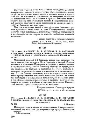1796 г. июня 6. — Рапорт М.И. Кутузова Н.И. Салтыкову с просьбой о возвращении к полкам штатных офицеров, находящихся в длительном откомандировании