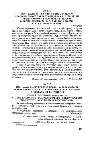 1797 г. декабря 29. — Из письма вице-канцлера действительного тайного советника А.Б. Куракина чрезвычайному посланнику в Пруссии тайному советнику Н.П. Панину о миссии М.И. Кутузова в Берлине. С-Петербург // Журнал «Русская старина», 1873 г., т. VIII, стр. 367.