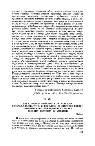 1798 г. апреля 27. — Письмо М.И. Кутузова генерал-адъютанту А.И. Нелидову об отправке Павлу I замечаний по операционному плану военных действий со Швецией. Выборг