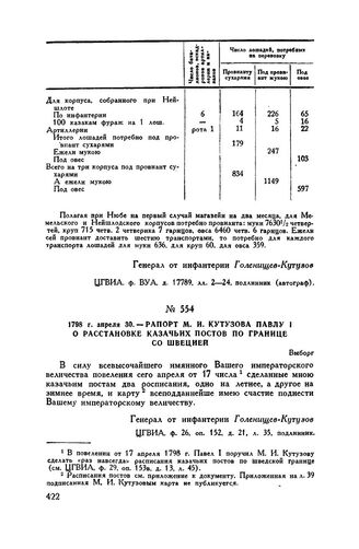 1798 г. апреля 30. — Рапорт М.И. Кутузова Павлу I о расстановке каз...
