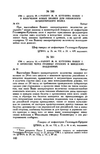 1798 г. августа 28. — Рапорт М.И. Кутузова Павлу I о получении новых знамен для Рязанского мушкетерского полка. Выборг // ЦГВИА, ф. 26, оп. 152, д. 24, л. 639, подлинник.