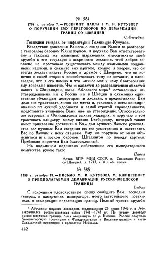 1798 г. октября 13. — Письмо М.И. Кутузова М. Клингспору о предполагаемой демаркации русско-шведской границы. Выборг // Архив ВПР МИД СССР, ф. Сношения России со Швецией, д. 1713, л. 9 и об.