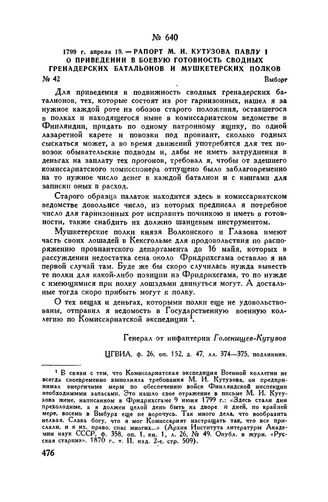 1799 г. апреля 19. — Рапорт М.И. Кутузова Павлу I о приведении в боевую готовность сводных гренадерских батальонов и мушкетерских полков. Выборг
