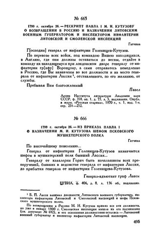 1799 г. октября 26. — Рескрипт Павла I М.И. Кутузову о возвращении в Россию и назначении Литовским военным губернатором и инспектором инфантерии Литовской и Смоленской инспекций. Гатчина