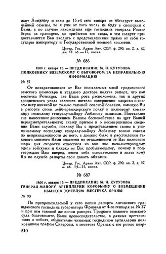 1800 г. января 10. — Предписание М.И. Кутузова полковнику Вяземскому с выговором за неправильную информацию // Центр. Гос. Архив Лит. ССР, ф. 290, оп. 2, д. 57, л. об. 14-15, копия.