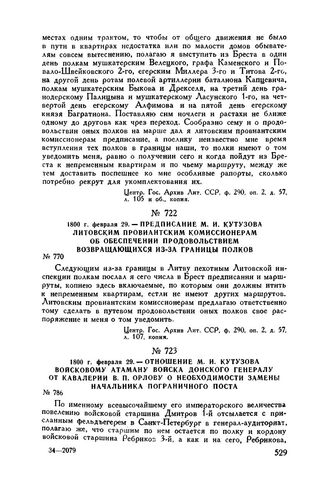 1800 г. февраля 29. — Предписание М.И. Кутузова литовским провиантским комиссионерам об обеспечении продовольствием возвращающихся из-за границы полков
