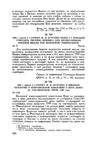 1800 г. апреля 2. — Рапорт М.И. Кутузова в Военную коллегию о неправильном взыскании с него денег за сентябрьскую треть 1799 года // Центр. Гос. Архив Лит. ССР, ф. 290, оп. 2, д. 57, лл. 173 об.-174, копия.