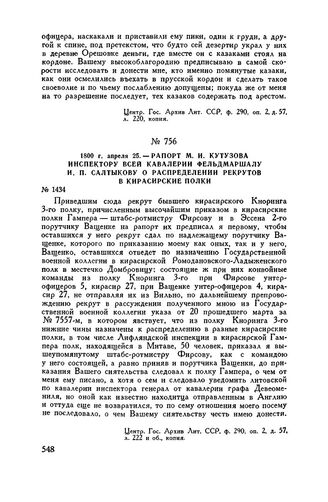 1800 г. апреля 25. — Рапорт М.И. Кутузова инспектору всей кавалерии фельдмаршалу И.П. Салтыкову о распределении рекрутов в кирасирские полки // Центр. Гос. Архив Лит. ССР, ф. 290, оп. 2, д. 57, л. 222 и об., копия.