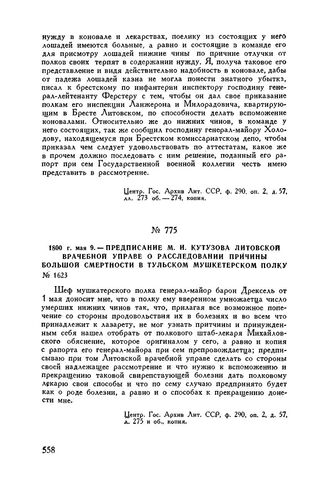 1800 г. мая 9. — Предписание М.И. Кутузова Литовской врачебной управе о расследовании причины большой смертности в Тульском мушкетерском полку // Центр. Гос. Архив Лит. ССР, ф. 290, оп. 2, д. 57, л. 275 и об., копия.