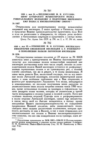 1800 г. мая 21. — Предписание М.И. Кутузова шефу Бутырского мушкетерского полка генерал-майору Белецкому о подготовке вверенного ему полка к инспекторскому смотру // Центр. Гос. Архив Лит. ССР, ф. 290, оп. 2, д. 57, 296 об., копия.