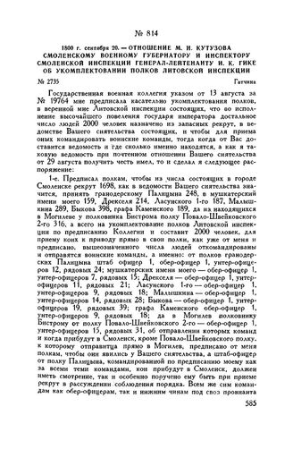 1800 г. сентября 20. — Отношение М.И. Кутузова смоленскому военному губернатору и инспектору Смоленской инспекции генерал-лейтенанту И.К. Гике об укомплектовании полков Литовской инспекции. Гатчина // Центр. Гос. Архив Лит. ССР, ф. 290, оп. 2, д. 32, лл. об. 10-об. 11, копия.
