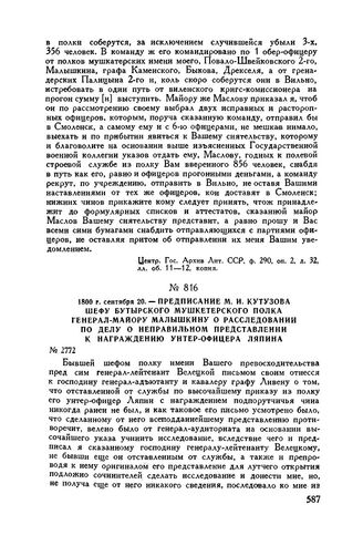 1800 г. сентября 20. — Предписание М.И. Кутузова шефу Бутырского мушкетерского полка генерал-майору Малышкину о расследовании по делу о неправильном представлении к награждению унтер-офицера Ляпина