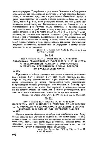 1800 г. октября [28]. — Отношение М.И. Кутузова литовскому гражданскому губернатору И.Г. Фризелю с предложением разрешать возникающие в казачьих пограничных полках вопросы по гражданской части // Центр. Гос. Архив Лит. ССР, ф. 290, оп. 2, д. 32, л. 54, копия.