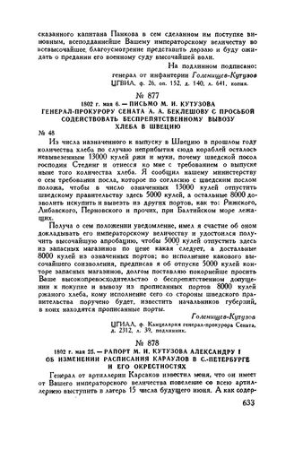1802 г. мая 6. — Письмо М.И. Кутузова генерал-прокурору Сената А.А. Беклешову с просьбой содействовать беспрепятственному вывозу хлеба в Швецию // ЦГИАЛ, ф. Канцелярия генерал-прокурора Сената, д. 2312, л. 39, подлинник.