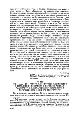 1802 г. августа 20. — Рапорт М.И. Кутузова Александру I о выполнении повеления о передаче генерал-адъютанту Е.Ф. Комаровскому обязанностей петербургского военного губернатора // ЦГВИА, ф. 26, оп. 152, д. 146, л. 578 и об., подлинник.