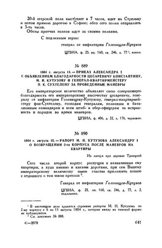 1804 г. августа 15. — Рапорт М.И. Кутузова Александру I о возвращении 2-го корпуса после маневров на квартиры. Из лагеря при деревне Троицкой