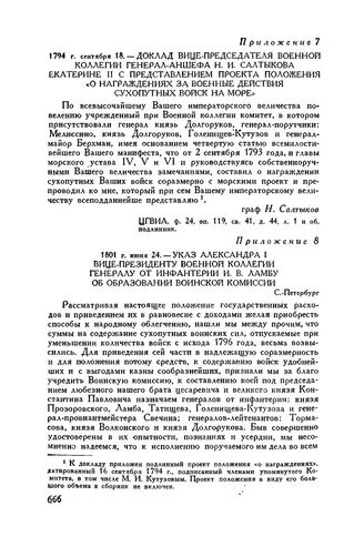 1794 г. сентября 18. — Доклад вице-председателя Военной коллегии генерал-аншефа Н.И. Салтыкова Екатерине II с представлением проекта положения «о награждениях за военные действия сухопутных войск на море» // ЦГВИА, ф. 24, оп. 119, св. 41, д. 44, л. 1 и об, подлинник.