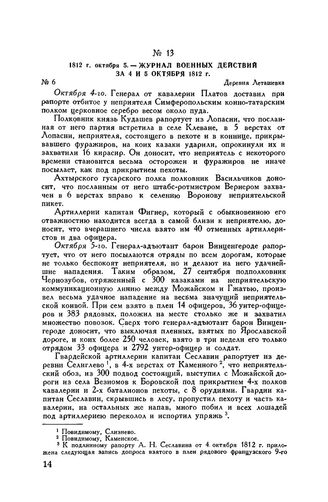 1812 г. октября 5. — Журнал военных действий за 4 и 5 октября 1812 г. Деревня Леташевка // ЦГИАЛ, ф. 1409, оп. 1, д. 649, лл. 36-39. Подлинник. Частично опублик. в прибавлении к газ. «Санктпетербургские ведомости», 18 октября 1812 г., № 84, полностью в «Сборнике исторических материалов, извлеченных из архива собственной е. и. в. канцелярии», вып. XIII, СПБ, 1906, стр. 20-21.